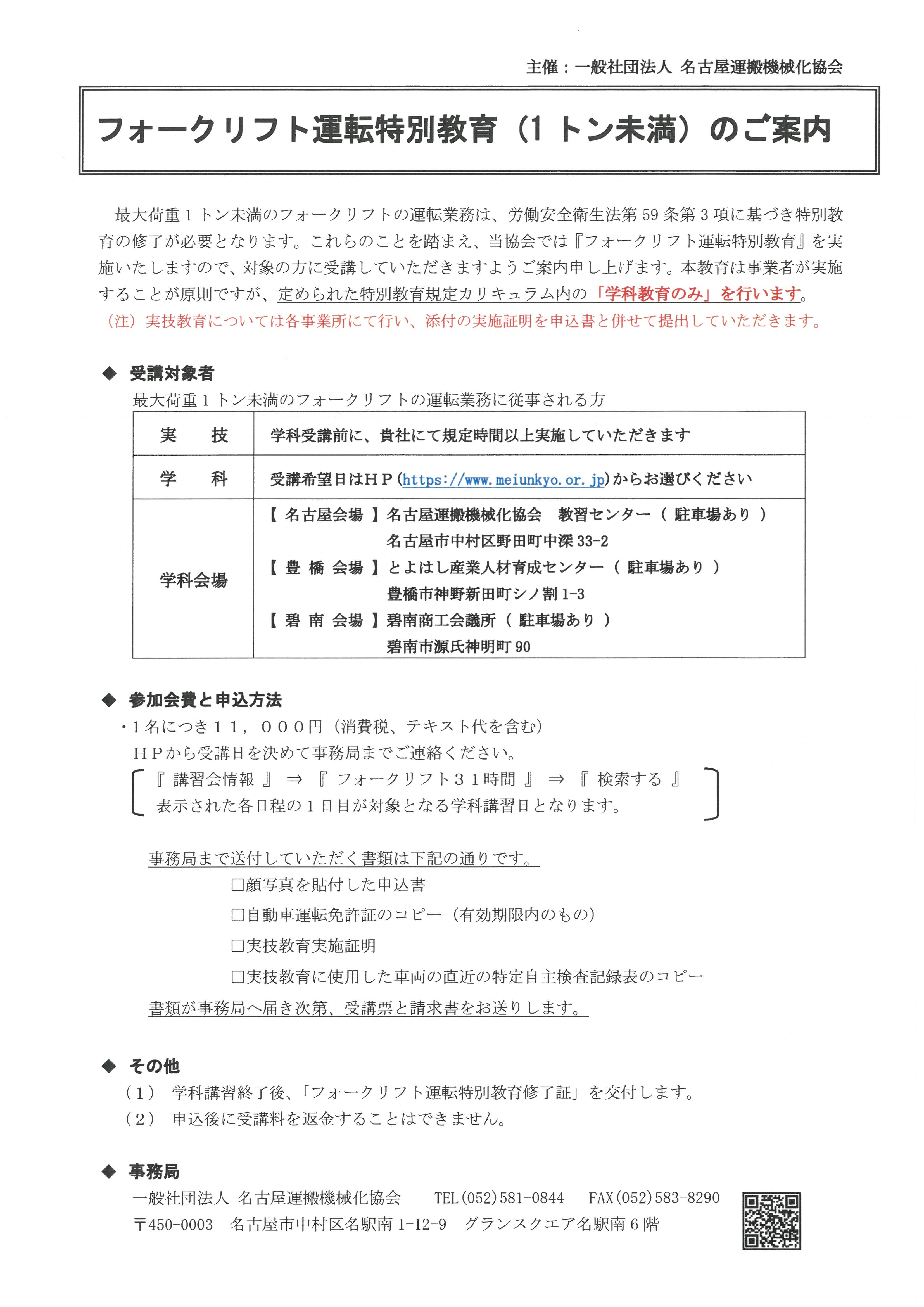 フォークリフト運転特別教育(1トン未満)のご案内